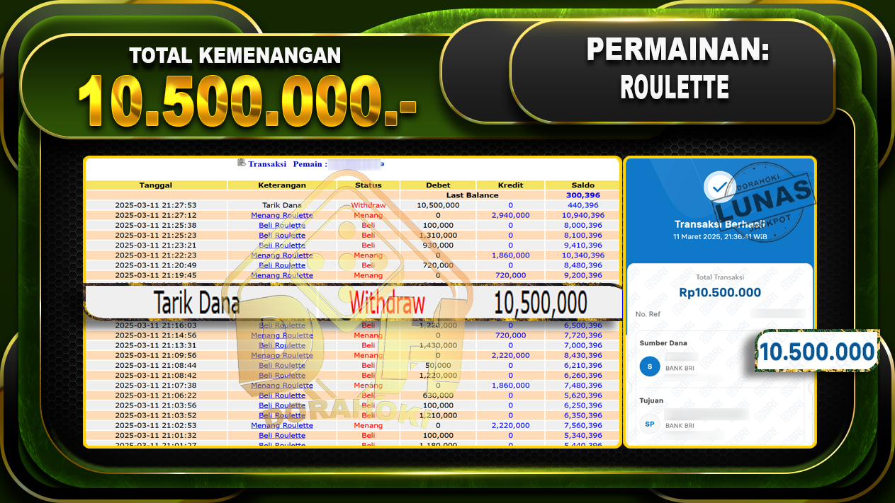 Bukti JP ROULETTE GAMES – ucapkan selamat kepada user id Berxxx atas kemenangan di ROULETTE GAMES dengan total kemenangan Rp.10.500.000,- . Yang pasti nya langsung LUNAS sesuai bukti ya bosku. Dorahoki nih bosku berapapun akan tetap kami bayar lunas ya bosku.