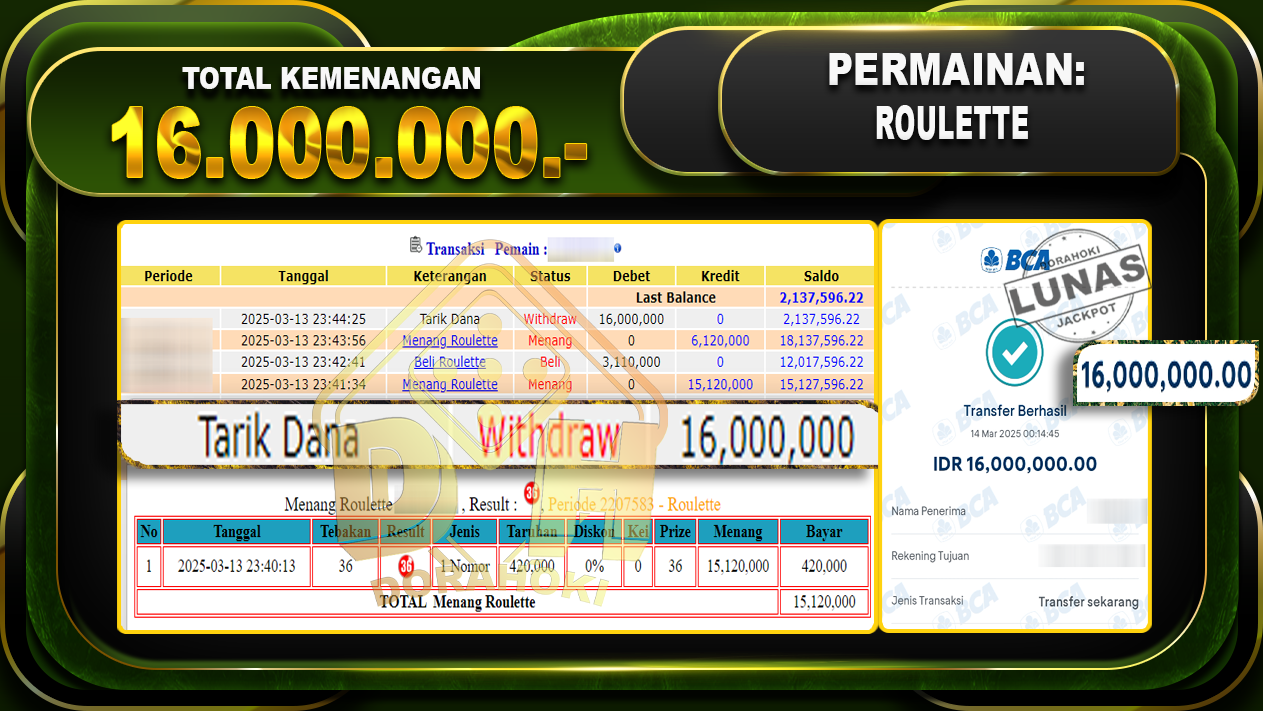 Bukti JP ROULETTE GAMES – ucapkan selamat kepada user id Arwxxx atas kemenangan di  ROULETTE GAMES  dengan total kemenangan Rp.16.000.000,- . Yang pasti nya langsung LUNAS sesuai bukti ya bosku. Dorahoki nih bosku berapapun akan tetap kami bayar lunas ya bosku.