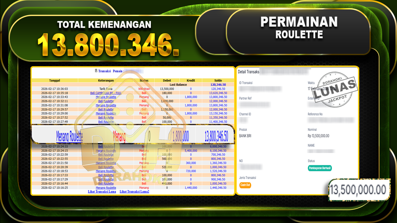 Bukti JP ROULETTE GAMES – ucapkan selamat kepada user id Berxxxx atas kemenangan di ROULETTE GAMES dengan total kemenangan Rp.13.800.346,- . Yang pasti nya langsung LUNAS sesuai bukti ya bosku. Kemenangan Berapapun Situs DoraHoki Akan Membayar Lunas yah