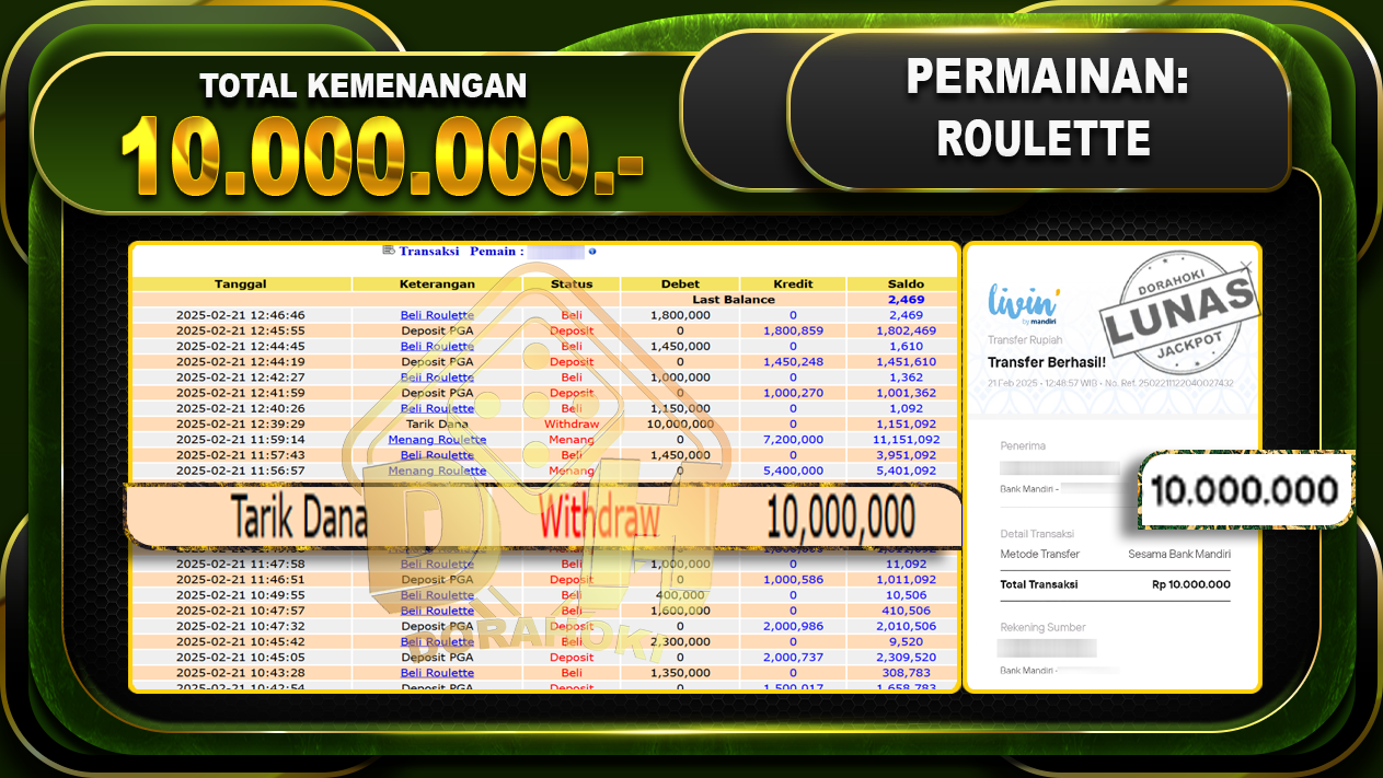 Bukti JP ROULETTE GAMES – ucapkan selamat kepada user id Omaxxx atas kemenangan di  ROULETTE GAMES  dengan total kemenangan Rp.10.000.000,- . Yang pasti nya langsung LUNAS sesuai bukti ya bosku. Dorahoki nih bosku berapapun akan tetap kami bayar lunas ya bosku.