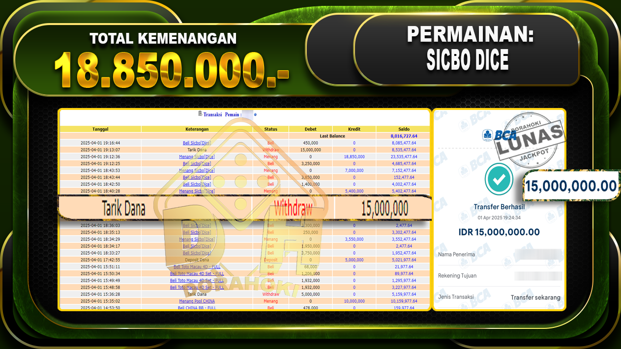 Bukti JP SICBO DICE – ucapkan selamat kepada user id Gapxxx atas kemenangan di SICBO DICE dengan total kemenangan Rp.18.850.000,- . Yang pasti nya langsung LUNAS sesuai bukti ya bosku. Dorahoki nih bosku berapapun akan tetap kami bayar lunas ya bosku.