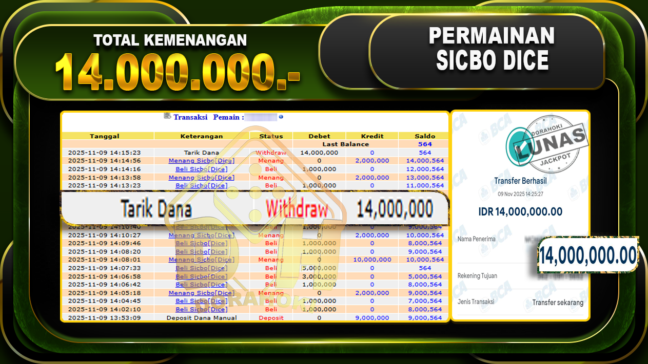Bukti JP Sicbo Dice – ucapkan selamat kepada user id hanxxxx atas kemenangan di Sicbo Dice dengan total kemenangan Rp.14,000,000,- Yang pasti nya langsung LUNAS sesuai bukti ya bosku. Dorahoki nih bosku berapapun akan tetap kami bayar lunas ya bosku.