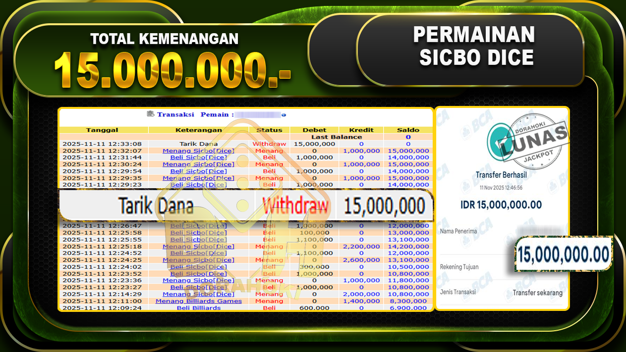 Bukti JP Sicbo Dice – ucapkan selamat kepada user id karxxxxx atas kemenangan di Sicbo Dice dengan total kemenangan Rp.15,000,000,- Yang pasti nya langsung LUNAS sesuai bukti ya bosku. Dorahoki nih bosku berapapun akan tetap kami bayar lunas ya bosku.