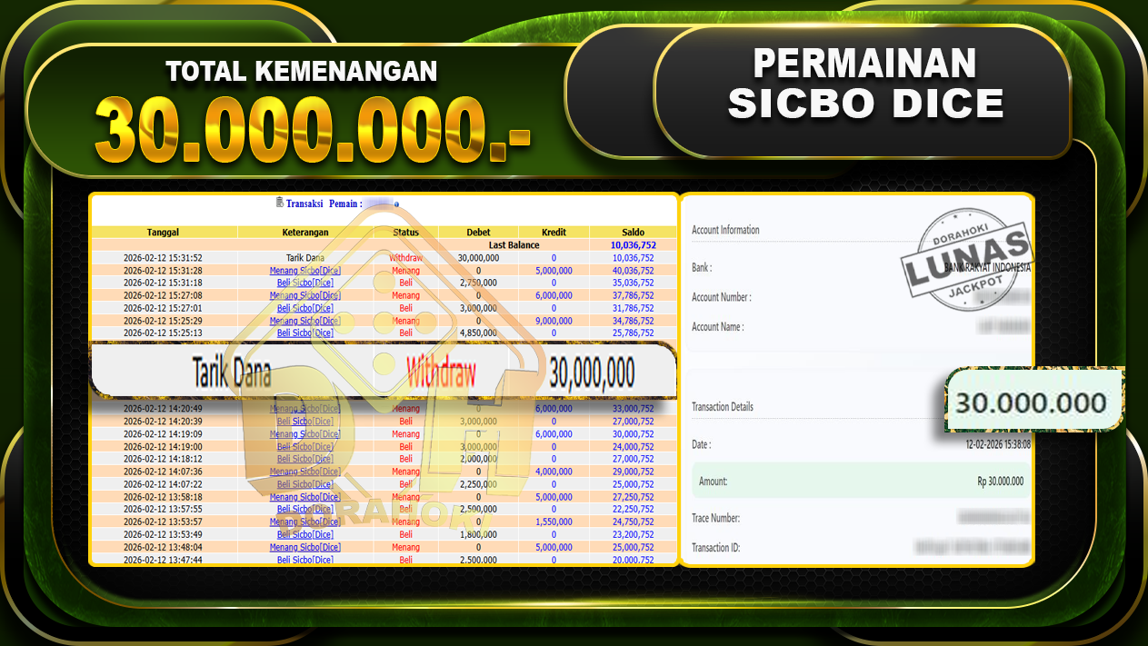 Bukti JP Sicbo Dice – Selamat Kepada User ID : yusxxx atas kemenangan Sicbo Dice Dengan Nominal Sebesar Rp.30.000.000,- Yang pasti nya langsung LUNAS Sesuai Bukti.