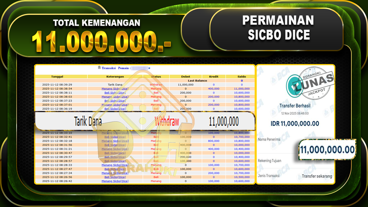 Bukti JP Sicbo Dice – ucapkan selamat kepada user id karxxxxx atas kemenangan di Sicbo Dice dengan total kemenangan Rp.11,000,000,- Yang pasti nya langsung LUNAS sesuai bukti ya bosku. Dorahoki nih bosku berapapun akan tetap kami bayar lunas ya bosku.