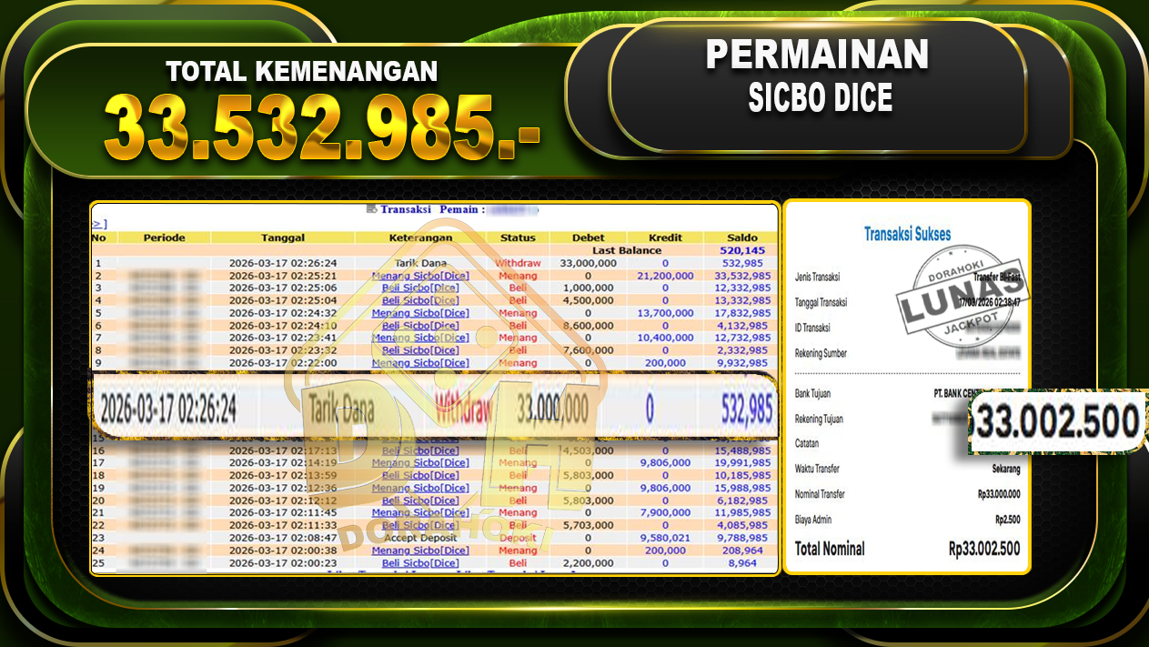 Bukti JP Sicbo Dice – Selamat Kepada User ID : Subxxxx atas kemenangan Sicbo Dice Dengan Nominal Sebesar Rp.33.532.985,- Yang pasti nya langsung LUNAS Sesuai Bukti.