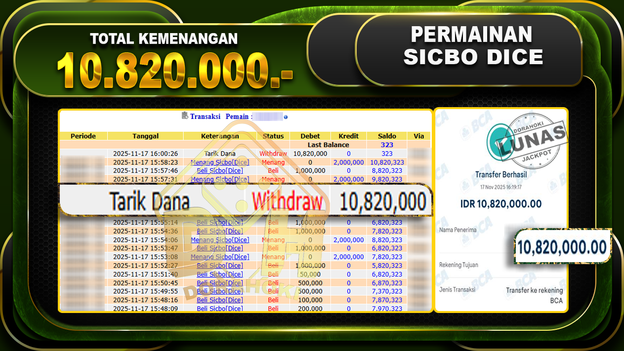 Bukti JP Sicbo Dice – ucapkan selamat kepada user id hamxxxx atas kemenangan di Sicbo Dice dengan total kemenangan Rp.10,820,000,- Yang pasti nya langsung LUNAS sesuai bukti ya bosku. Dorahoki nih bosku berapapun akan tetap kami bayar lunas ya bosku.