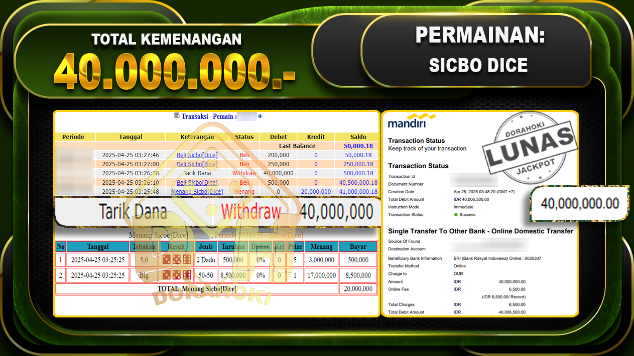 Bukti JP SICBO DICE – ucapkan selamat kepada user id Dinxxx atas kemenangan di SICBO DICE dengan total kemenangan Rp.40.000.000,- . Yang pasti nya langsung LUNAS sesuai bukti ya bosku. Dorahoki nih bosku berapapun akan tetap kami bayar lunas ya bosku.