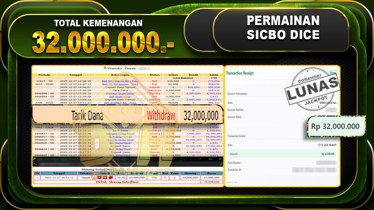 Bukti JP Sicbo Dice – ucapkan selamat kepada user id antxxx atas kemenangan di Sicbo Dice dengan total kemenangan Rp.32,000,000,- Yang pasti nya langsung LUNAS sesuai bukti ya bosku. Dorahoki nih bosku berapapun akan tetap kami bayar lunas ya bosku.