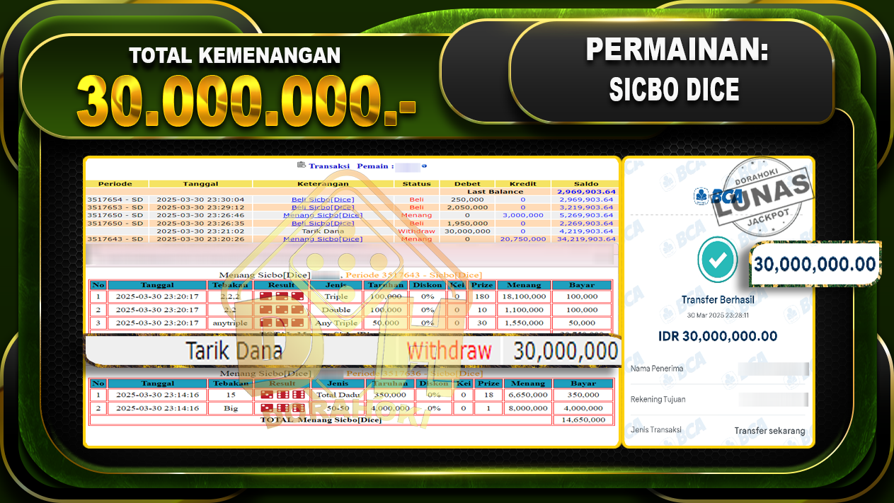 Bukti JP SICBO DICE – ucapkan selamat kepada user id Gapxxx atas kemenangan di  SICBO DICE  dengan total kemenangan Rp.30.000.000,- . Yang pasti nya langsung LUNAS sesuai bukti ya bosku. Dorahoki nih bosku berapapun akan tetap kami bayar lunas ya bosku.