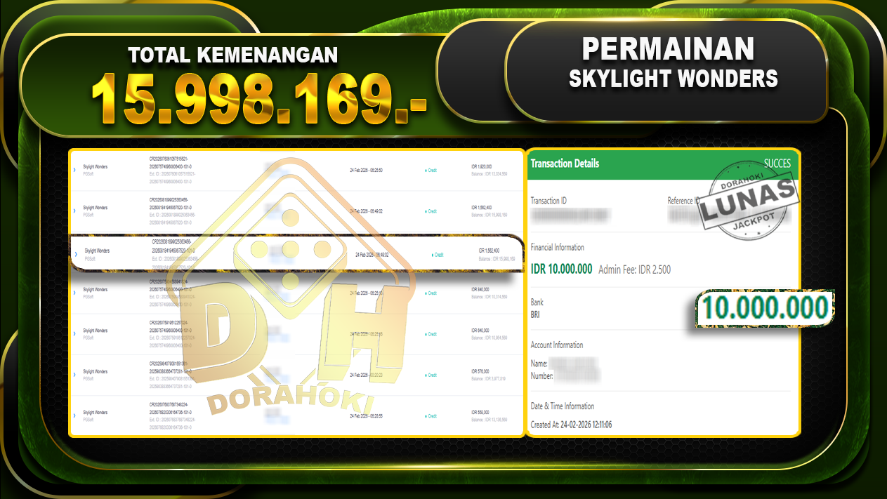 Bukti JP Skylight Wonders – ucapkan selamat kepada user id Salxxxxx atas kemenangan di Skylight Wonders dengan total kemenangan Rp.15.998.169,- Yang pasti nya langsung LUNAS Sesuai Bukti.