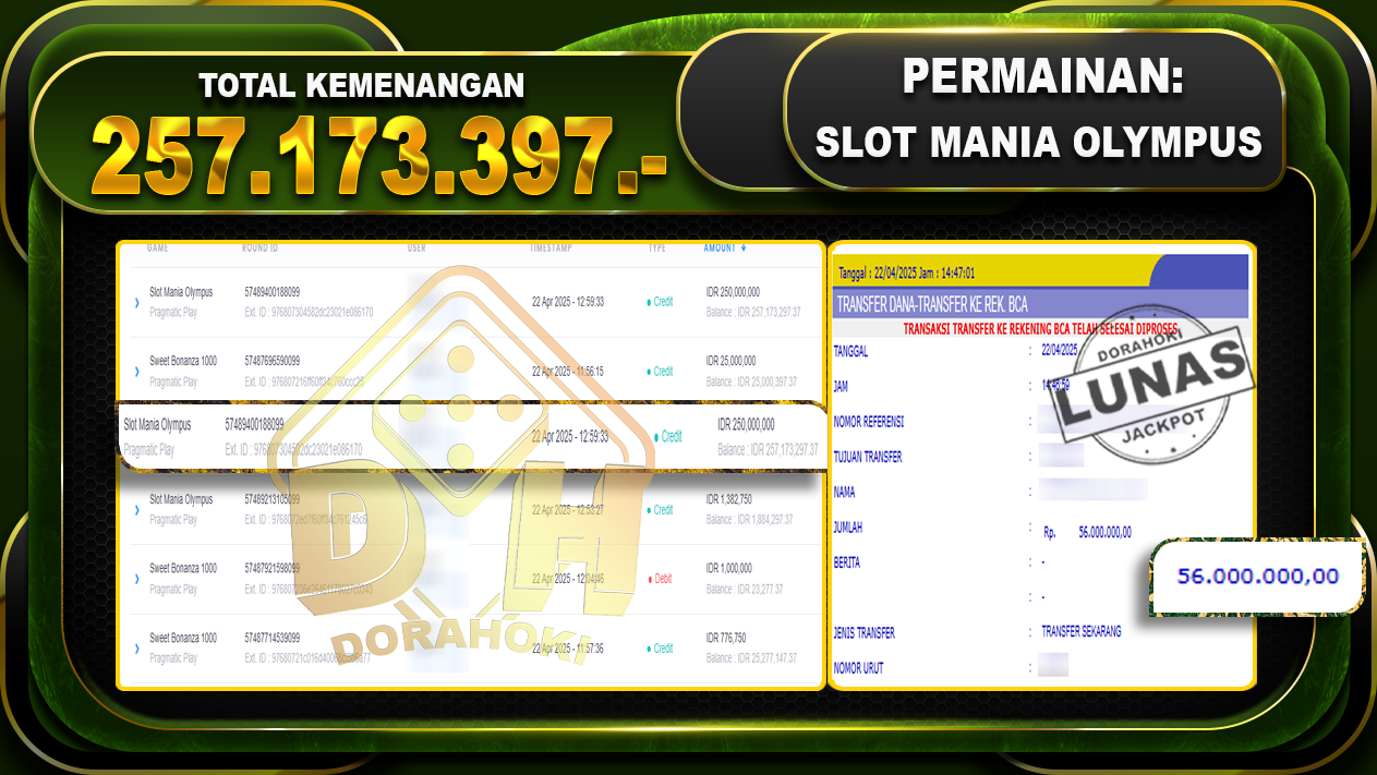 Bukti JP SLOT MANIA OLYMPUS – ucapkan selamat kepada user id Boyxxx atas kemenangan di SLOT MANIA OLYMPUS dengan total kemenangan Rp.257.173.397,- . Yang pasti nya langsung LUNAS sesuai bukti ya bosku. Dorahoki nih bosku berapapun akan tetap kami bayar lunas ya bosku.
