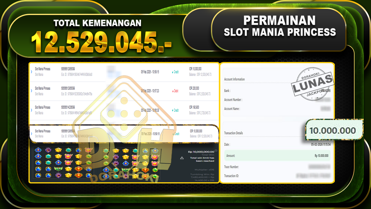 Bukti JP SLOT MANIA PRINCESS – ucapkan selamat kepada user id norxxx atas kemenangan di SLOT MANIA PRINCESS dengan total kemenangan Rp.12.529.045,- . Yang pasti nya langsung LUNAS sesuai bukti ya bosku. Dorahoki nih bosku berapapun akan tetap kami bayar lunas ya bosku.