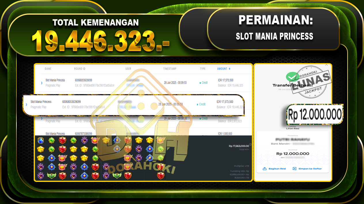 Bukti JP SLOT MANIA PRINCESS – ucapkan selamat kepada user id DORxxx atas kemenangan di SLOT MANIA PRINCESS dengan total kemenangan Rp.19.446.323,- . Yang pasti nya langsung LUNAS sesuai bukti ya bosku. Dorahoki nih bosku berapapun akan tetap kami bayar lunas ya bosku.
