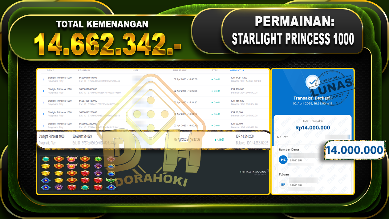 Bukti JP STARLIGHT PRINCESS 1000 – ucapkan selamat kepada user id Parxxx atas kemenangan di STARLIGHT PRINCESS 1000 dengan total kemenangan Rp.14,662.342,- . Yang pasti nya langsung LUNAS sesuai bukti ya bosku. Dorahoki nih bosku berapapun akan tetap kami bayar lunas ya bosku