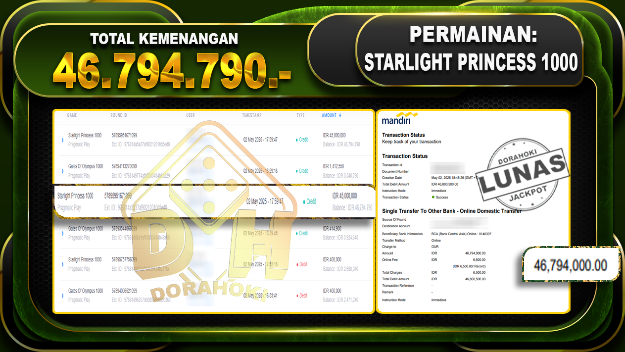Bukti JP STARLIGHT PRINCESS 1000 – ucapkan selamat kepada user id Marxxx atas kemenangan di STARLIGHT PRINCESS 1000 dengan total kemenangan Rp.46.794.790,- . Yang pasti nya langsung LUNAS sesuai bukti ya bosku. Dorahoki nih bosku berapapun akan tetap kami bayar lunas ya bosku
