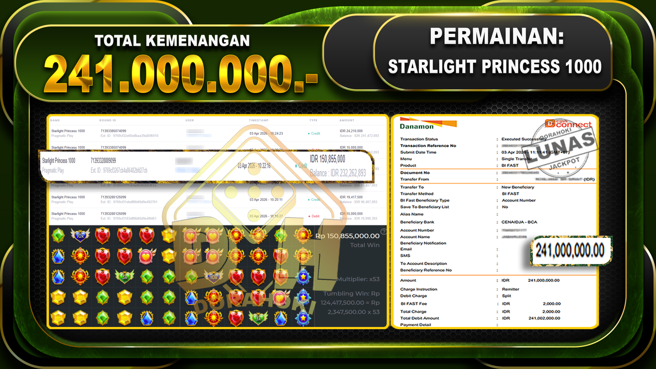 Bukti JP Starlight Princess 1000 – Selamat Kepada User ID : Abaxxxx atas kemenangan Starlight Princess 1000 Dengan Nominal Sebesar Rp.241.000.000,- Yang pasti nya langsung LUNAS Sesuai Bukti.