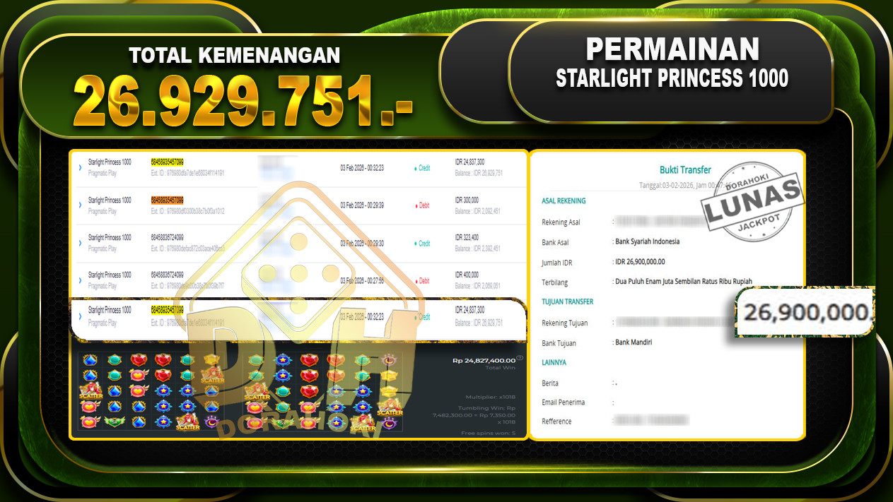 Bukti JP Starlight Princess 1000 Selamat Kepada User ID : busxxxxx atas kemenangan Starlight Princess 1000