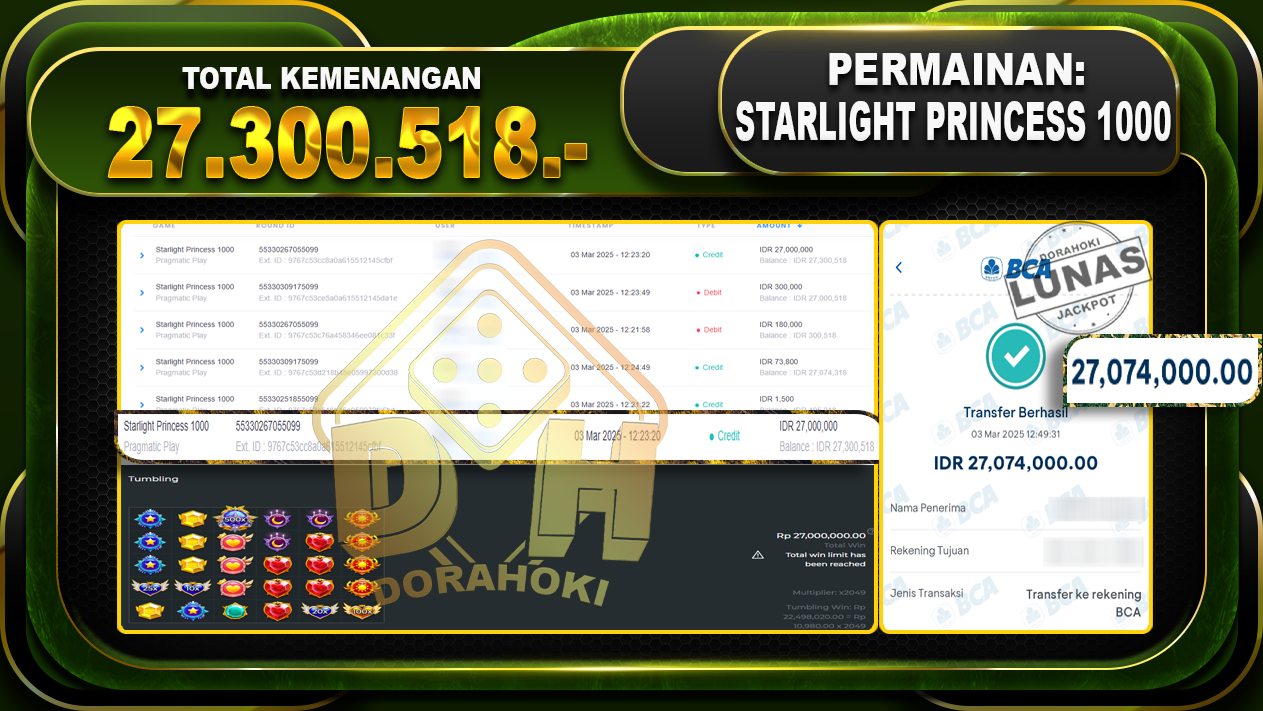 Bukti JP STARLIGHT PRINCESS 1000 – ucapkan selamat kepada user id Aroxxx atas kemenangan di STARLIGHT PRINCESS 1000 dengan total kemenangan Rp.27,300.518,- . Yang pasti nya langsung LUNAS sesuai bukti ya bosku. Dorahoki nih bosku berapapun akan tetap kami bayar lunas ya bosku.