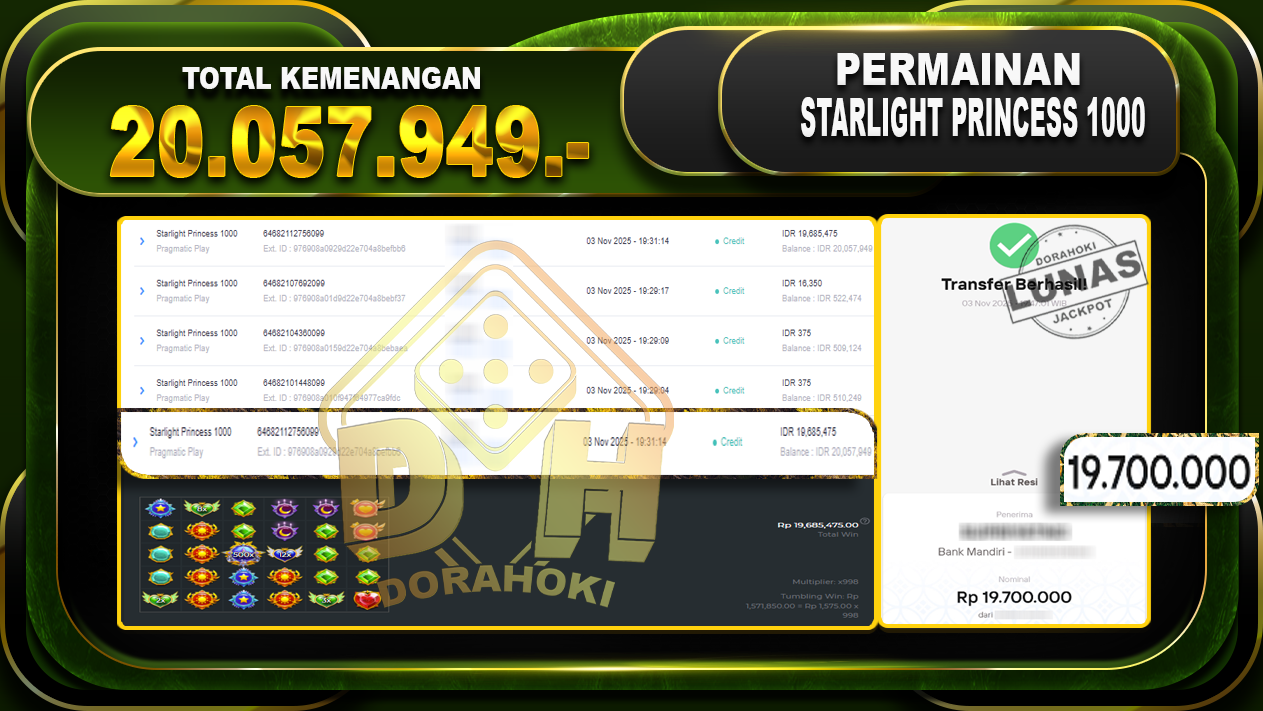 Bukti JP Starlight Princess 1000 – ucapkan selamat kepada user id surxxxxx atas kemenangan di Starlight Princess 1000 dengan total kemenangan Rp.20,057,949,- Yang pasti nya langsung LUNAS sesuai bukti ya bosku. Dorahoki nih bosku berapapun akan tetap kami bayar lunas ya bosku