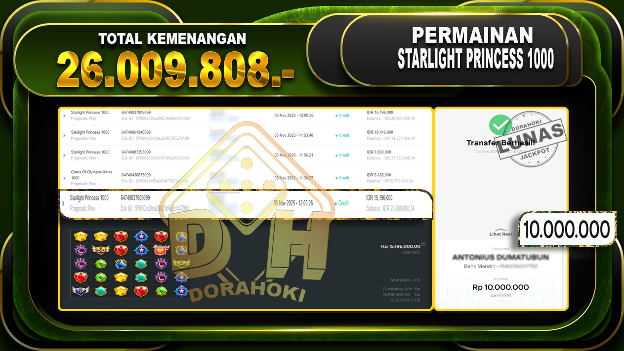 Bukti JP Starlight Princess 1000 – ucapkan selamat kepada user id nayxxxxx atas kemenangan di Starlight Princess 1000 dengan total kemenangan Rp.26,009,808,- Yang pasti nya langsung LUNAS sesuai bukti ya bosku. Dorahoki nih bosku berapapun akan tetap kami bayar lunas ya bosku
