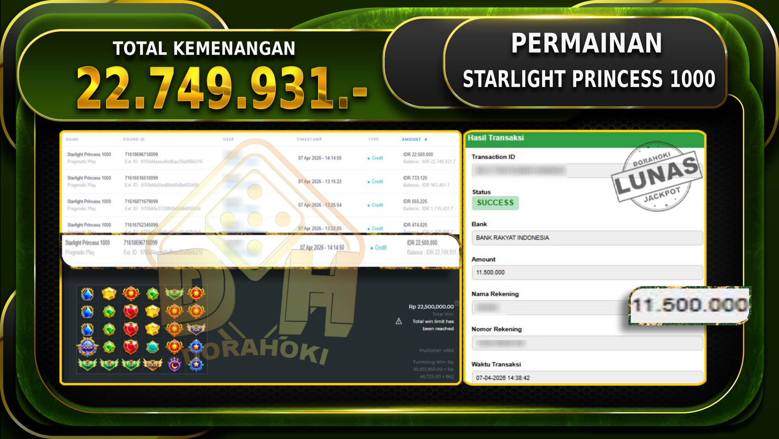 Bukti JP Starlight Princess 1000 – Selamat Kepada User ID : Krixx atas kemenangan Starlight Princess 1000 Dengan Nominal Sebesar Rp.22,749.931,- Yang pasti nya langsung LUNAS Sesuai Bukti.