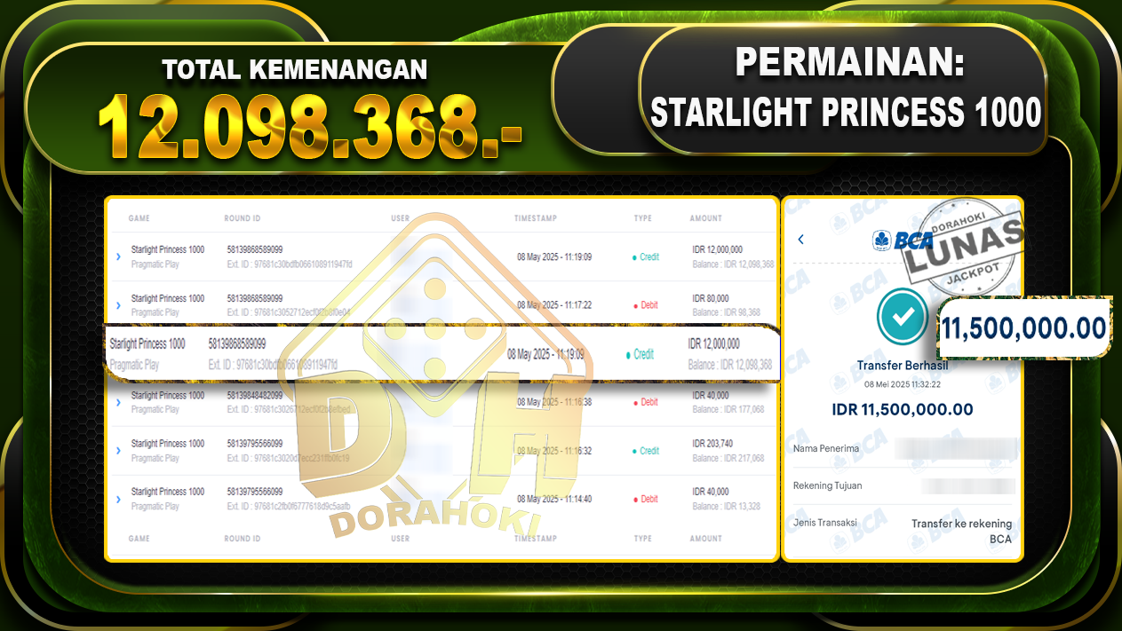 Bukti JP STARLIGHT PRINCESS 1000 – ucapkan selamat kepada user id Bhexxx atas kemenangan di STARLIGHT PRINCESS 1000 dengan total kemenangan Rp.12.098.368,- . Yang pasti nya langsung LUNAS sesuai bukti ya bosku. Dorahoki nih bosku berapapun akan tetap kami bayar lunas ya bosku
