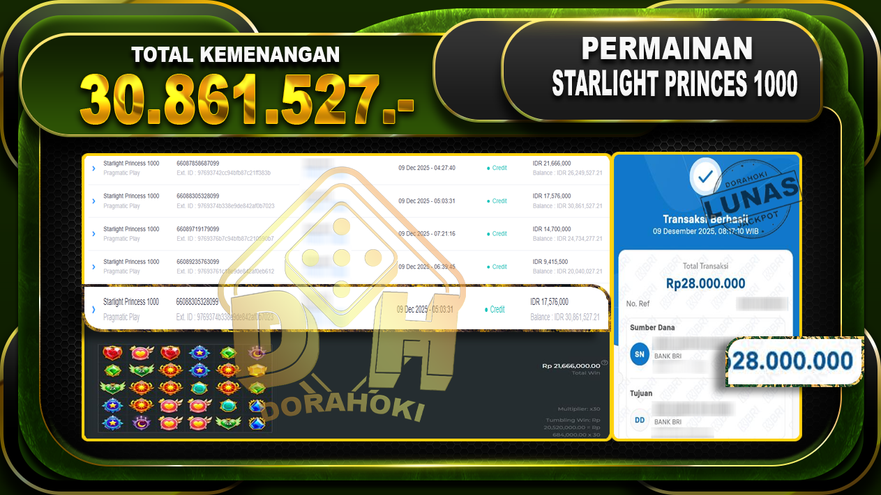 Bukti JP Starlight Princess 1000 – ucapkan selamat kepada user id dwixxxxx atas kemenangan di Starlight Princess 1000 dengan total kemenangan Rp.30,861.527,- Yang pasti nya langsung LUNAS sesuai bukti ya bosku. Dorahoki nih bosku berapapun akan tetap kami bayar lunas ya bosku