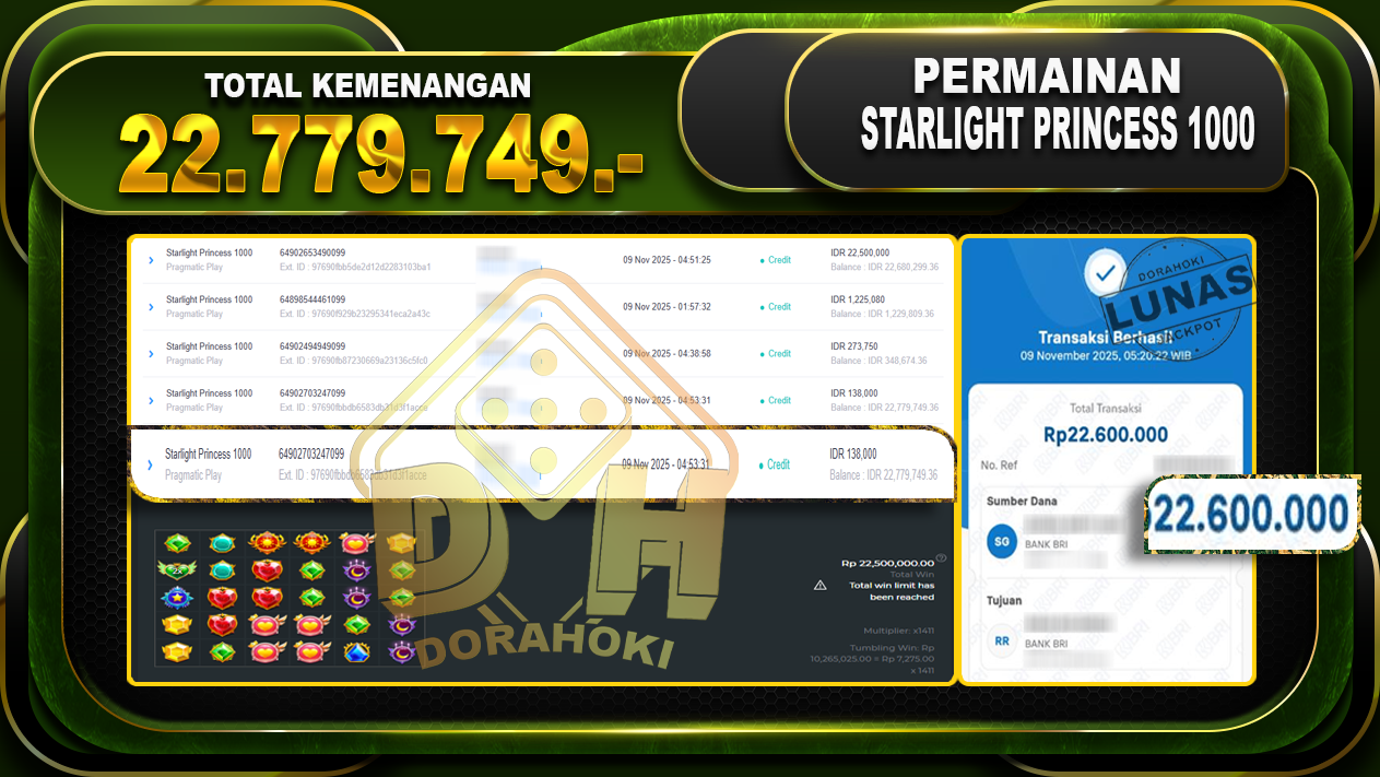 Bukti JP Starlight Princess 1000 – ucapkan selamat kepada user id riaxxxxx atas kemenangan di Starlight Princess 1000 dengan total kemenangan Rp.22,779,749,- Yang pasti nya langsung LUNAS sesuai bukti ya bosku. Dorahoki nih bosku berapapun akan tetap kami bayar lunas ya bosku