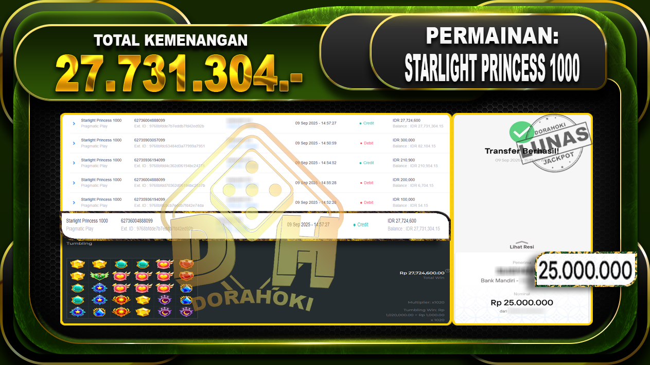 Bukti JP Starlight Princess 1000 – ucapkan selamat kepada user id Anakxxxxx atas kemenangan di Starlight Princess 1000 dengan total kemenangan Rp.27,731,304,- Yang pasti nya langsung LUNAS sesuai bukti ya bosku. Dorahoki nih bosku berapapun akan tetap kami bayar lunas ya bosku