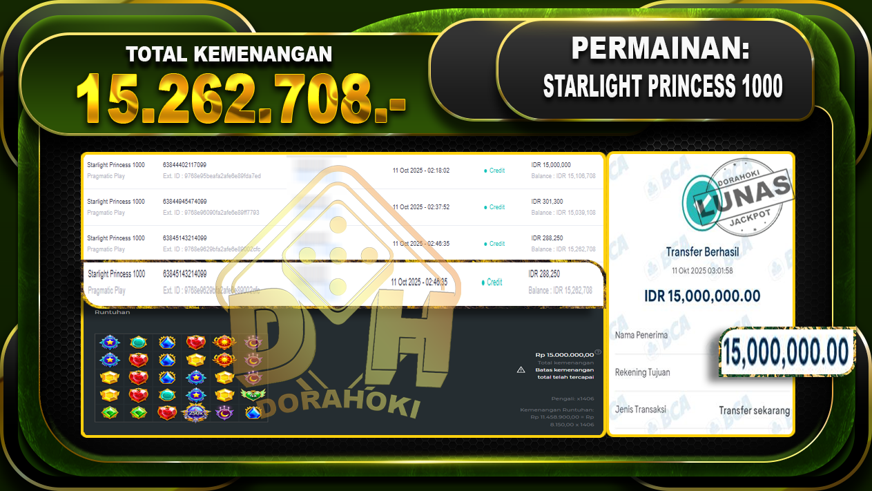Bukti JP Starlight Princess 1000 ucapkan selamat kepada user id budxxxxxx atas kemenangan di  Starlight Princess 1000 dengan total kemenangan Rp.15,262,708,- Yang pasti nya langsung LUNAS sesuai bukti ya bosku. Dorahoki nih bosku berapapun akan tetap kami bayar lunas ya bosku