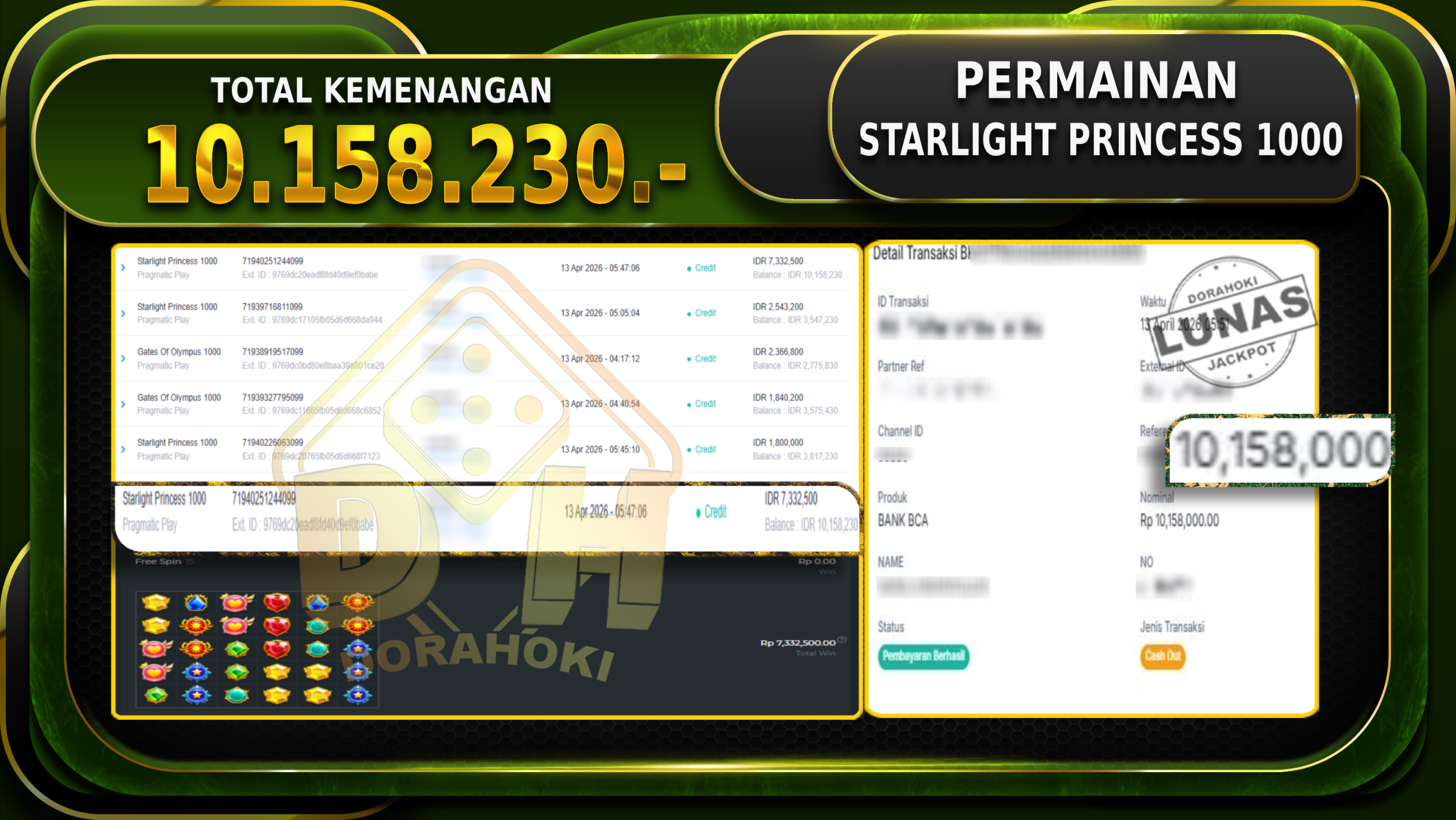 Bukti JP Starlight Princess 1000 – Selamat Kepada User ID : Escxx atas kemenangan Starlight Princess 1000 Dengan Nominal Sebesar Rp.10.158.230,- Yang pasti nya langsung LUNAS Sesuai Bukti.