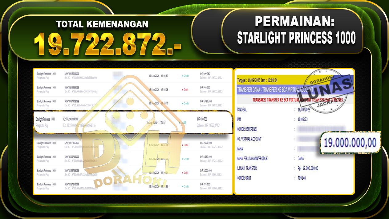 Bukti JP Starlight Princess 1000 – ucapkan selamat kepada user id Dwixxxxxx atas kemenangan di Starlight Princess 1000 dengan total kemenangan Rp.19,722,872,- Yang pasti nya langsung LUNAS sesuai bukti ya bosku. Dorahoki nih bosku berapapun akan tetap kami bayar lunas ya bosku