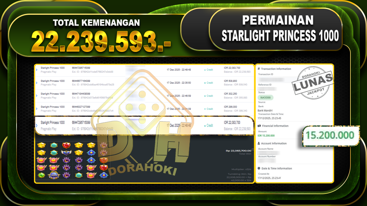 Bukti JP Starlight Princess 1000 – ucapkan selamat kepada user id andxxxxx atas kemenangan di Starlight Princess 1000 dengan total kemenangan Rp.22,239.593,- Yang pasti nya langsung LUNAS sesuai bukti ya bosku. Dorahoki nih bosku berapapun akan tetap kami bayar lunas ya bosku