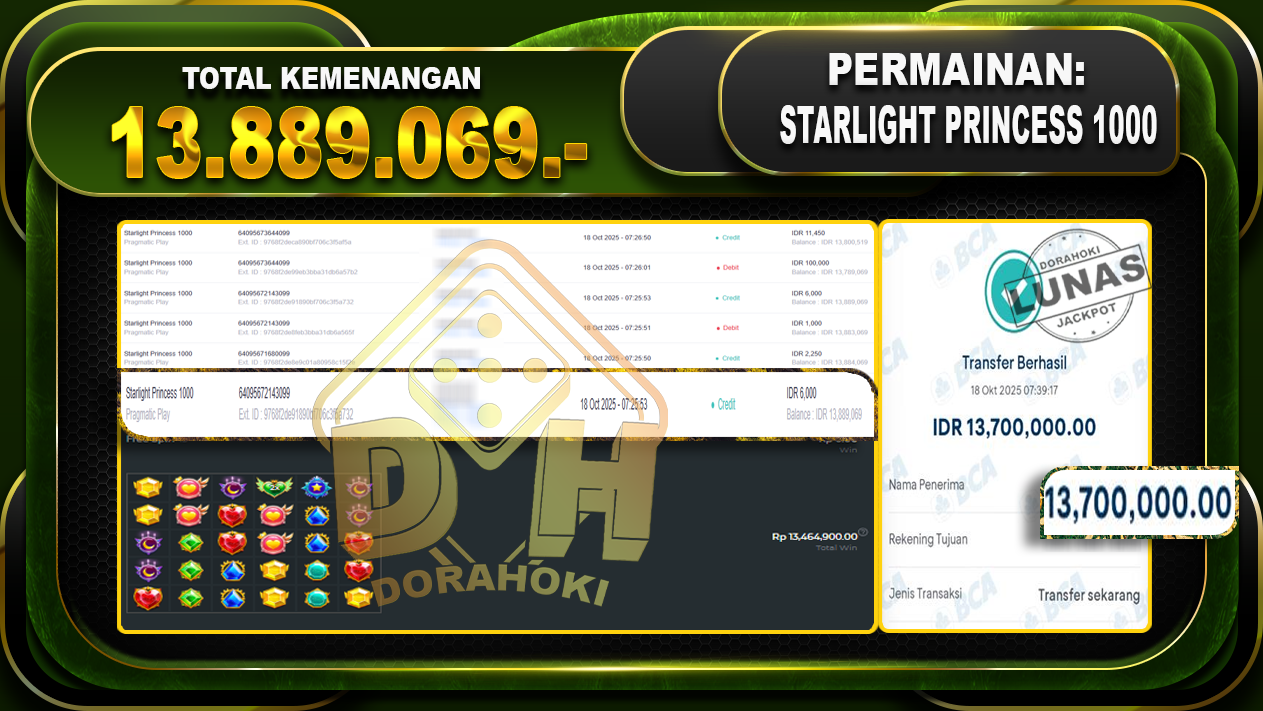 Bukti JP Starlight Princess 1000 – ucapkan selamat kepada user id budxxxxxxx atas kemenangan di Starlight Princess 1000 dengan total kemenangan Rp.13,889,069,- Yang pasti nya langsung LUNAS sesuai bukti ya bosku. Dorahoki nih bosku berapapun akan tetap kami bayar lunas ya bosku