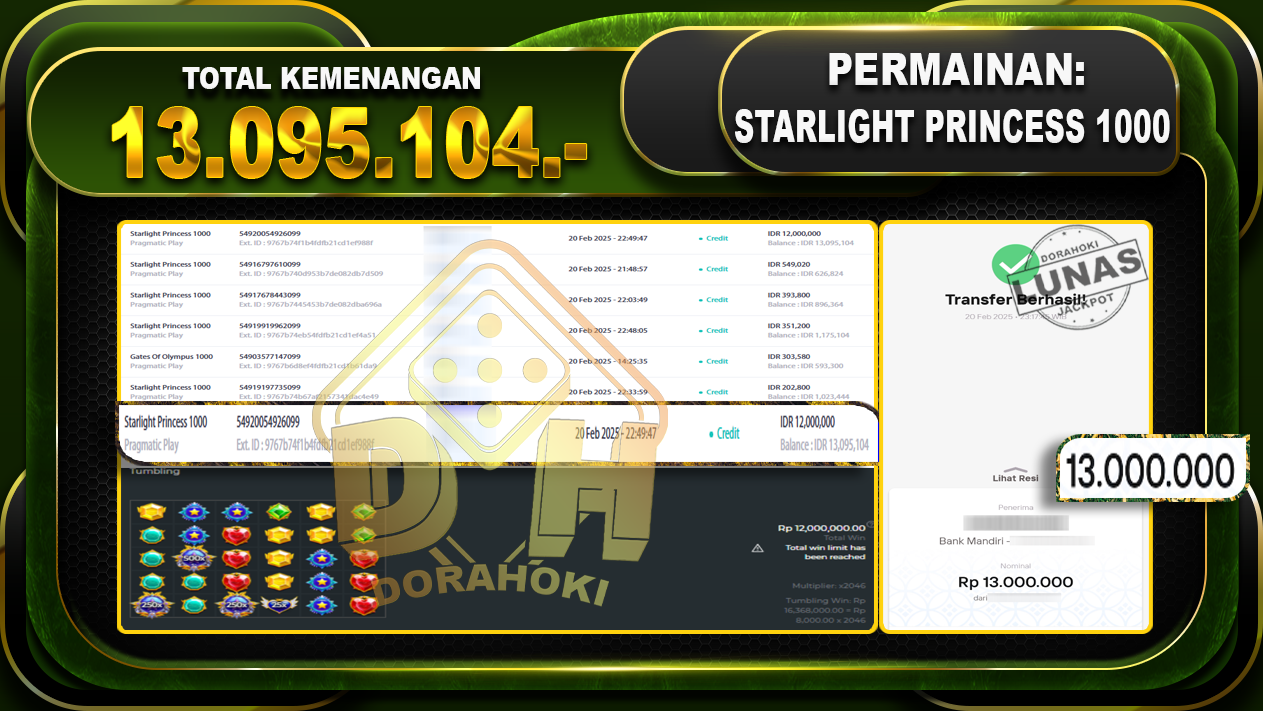 Bukti JP STARLIGHT PRINCESS 1000 – ucapkan selamat kepada user id SYAKIRxxx atas kemenangan di STARLIGHT PRINCESS 1000 dengan total kemenangan Rp.13,095.104,- . Yang pasti nya langsung LUNAS sesuai bukti ya bosku. Dorahoki nih bosku berapapun akan tetap kami bayar lunas ya bosku.