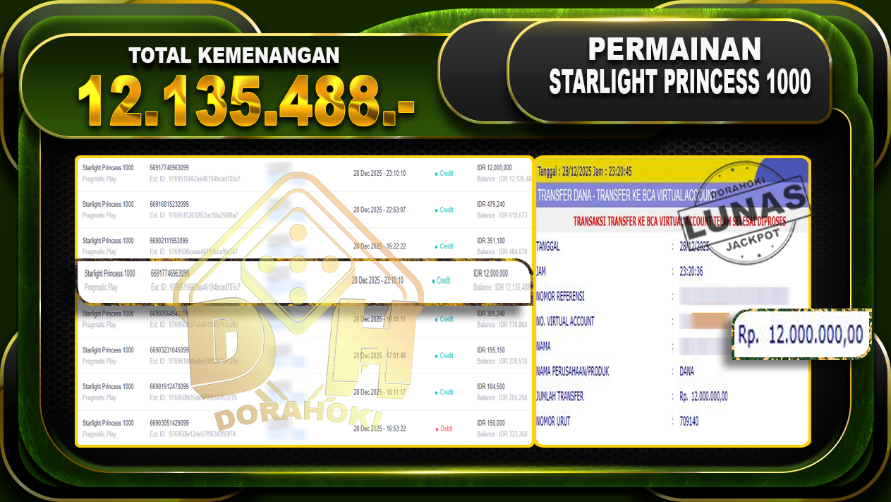 Bukti JP Starlight Princess 1000 – ucapkan selamat kepada user id ruwxxxxx atas kemenangan di Starlight Princess 1000 dengan total kemenangan Rp.12.135.488,- Yang pasti nya langsung LUNAS sesuai bukti ya bosku. Dorahoki nih bosku berapapun akan tetap kami bayar lunas ya bosku