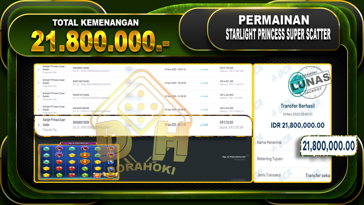 Bukti JP Starlight Princess super scatter – ucapkan selamat kepada user id bigxxxx atas kemenangan di Starlight Princess super scatter dengan total kemenangan Rp.21,800,000,- Yang pasti nya langsung LUNAS sesuai bukti ya bosku. Dorahoki nih bosku berapapun akan tetap kami bayar lunas ya bosku