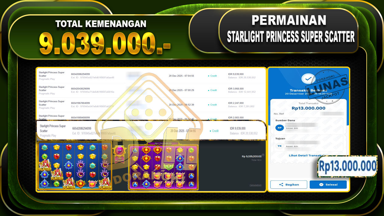Bukti JP Starlight Princess super scatter – ucapkan selamat kepada user id gigxxxxx atas kemenangan di Starlight Princess super scatter dengan total kemenangan Rp.9.039.000,- Yang pasti nya langsung LUNAS sesuai bukti ya bosku. Dorahoki nih bosku berapapun akan tetap kami bayar lunas ya bosku
