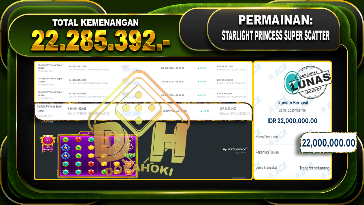 Bukti JP Starlight Princess super scatter – ucapkan selamat kepada user id derxxx atas kemenangan di Starlight Princess super scatter dengan total kemenangan Rp.22,285,392,- Yang pasti nya langsung LUNAS sesuai bukti ya bosku. Dorahoki nih bosku berapapun akan tetap kami bayar lunas ya bosku