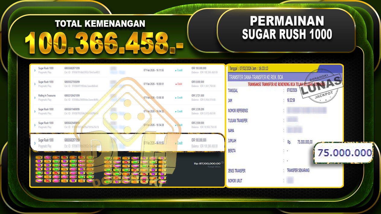 Bukti JP Sugar Rush 1000 – Selamat Kepada User ID : samxx atas kemenangan Sugar Rush 1000 Dengan Nominal Sebesar Rp.100.366.458,- Yang pasti nya langsung LUNAS Sesuai Bukti.
