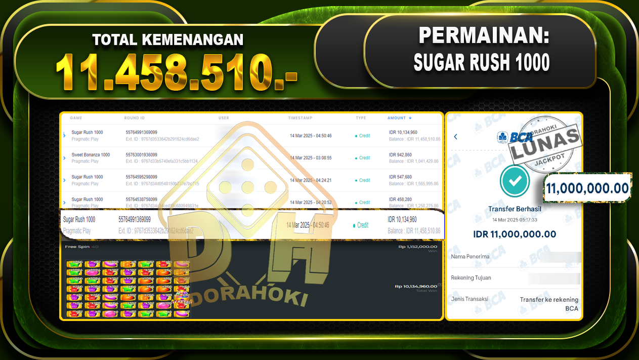 Bukti JP SUGAR RUSH 1000 – ucapkan selamat kepada user id Buhxxx atas kemenangan di SUGAR RUSH 1000 dengan total kemenangan Rp.14.458.510,- . Yang pasti nya langsung LUNAS sesuai bukti ya bosku. Dorahoki nih bosku berapapun akan tetap kami bayar lunas ya bosku.
