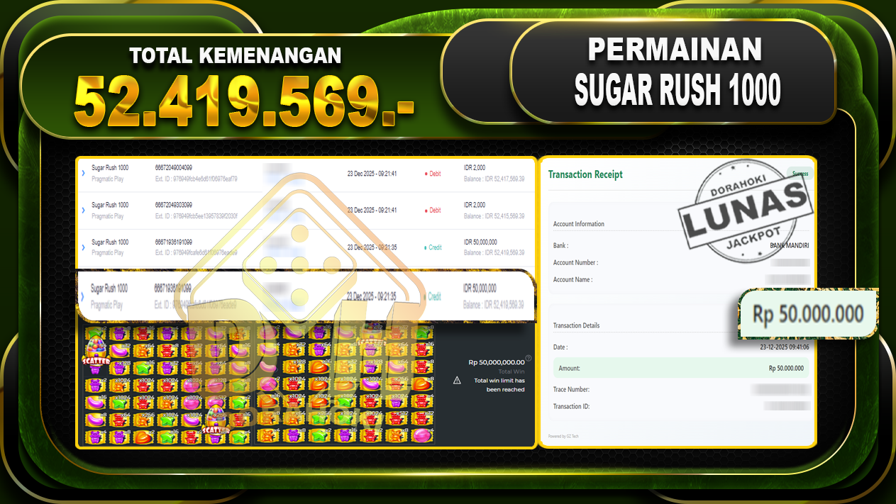 Bukti JP Sugar Rush 1000 – ucapkan selamat kepada user id chixx atas kemenangan di Sugar Rush 1000 dengan total kemenangan Rp.52.419.569,- Yang pasti nya langsung LUNAS sesuai bukti ya bosku. Dorahoki nih bosku berapapun akan tetap kami bayar lunas ya bosku