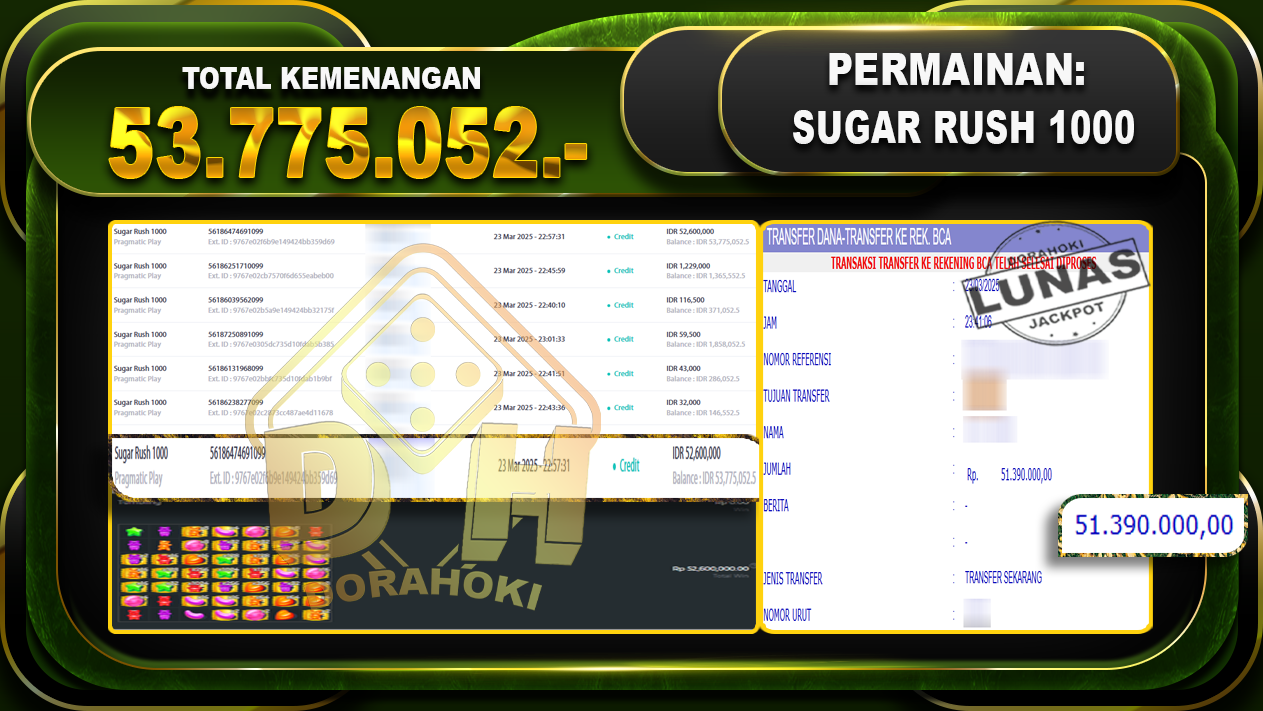 Bukti JP SUGAR RUSH 1000 – ucapkan selamat kepada user id Dwlxxx atas kemenangan di SUGAR RUSH 1000 dengan total kemenangan Rp.53.775.052,- . Yang pasti nya langsung LUNAS sesuai bukti ya bosku. Dorahoki nih bosku berapapun akan tetap kami bayar lunas ya bosku.