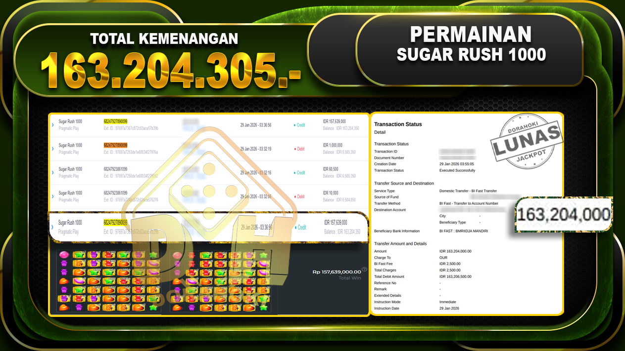 Bukti JP Sugar Rush 1000 – Selamat Kepada User ID : astxx atas kemenangan Sugar Rush 1000 Dengan Nominal Sebesar Rp.163.204.305,- Yang pasti nya langsung LUNAS Sesuai Bukti.