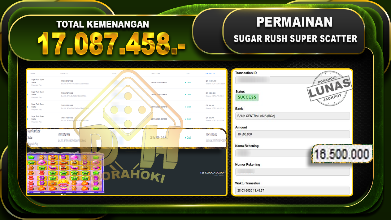 Bukti JP Sugar Rush Super Scatter – ucapkan selamat kepada user id Robxxx atas kemenangan di Sugar Rush Super Scatter dengan total kemenangan Rp.17.087.458,- . Yang pasti nya langsung LUNAS Sesuai Bukti.