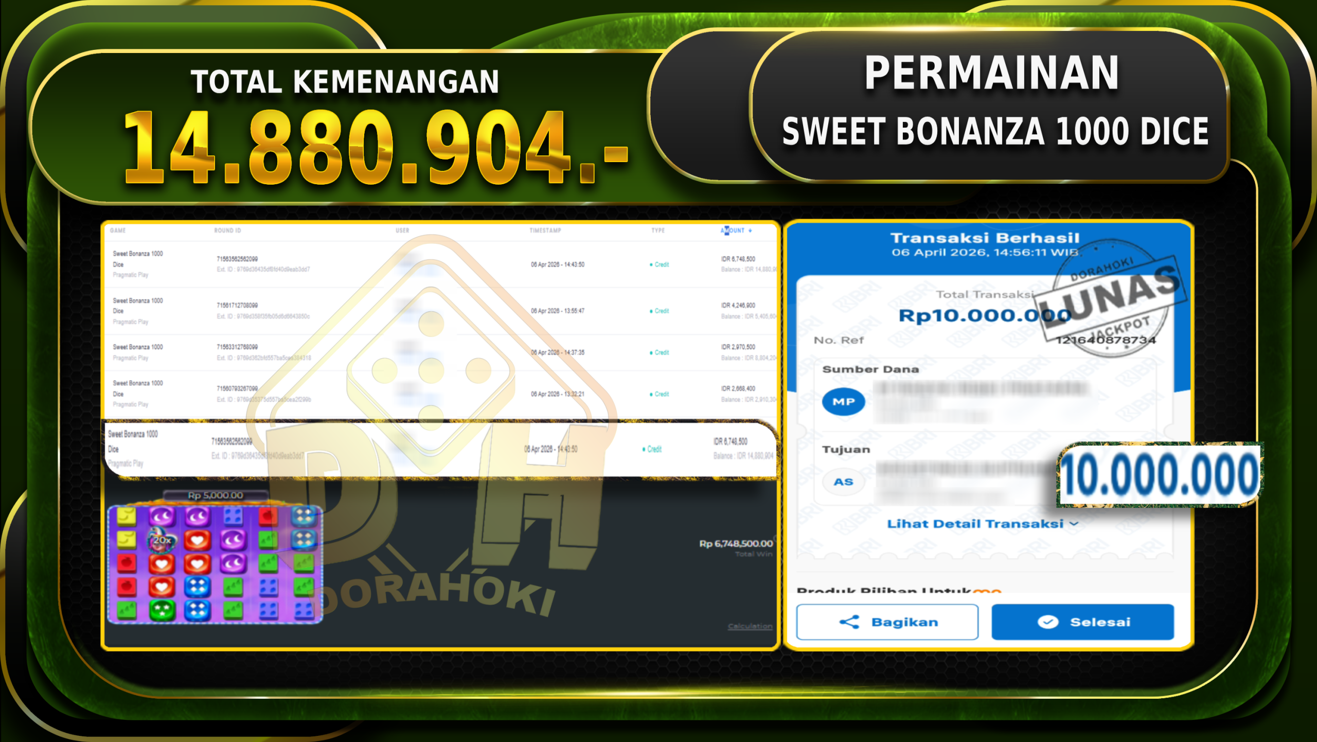 Bukti JP Sweet Bonanza 1000 Dice – Selamat Kepada User ID : Kakxxx atas kemenangan Sweet Bonanza 1000 Dice Dengan Nominal Sebesar Rp.14.880.904,- Yang pasti nya langsung LUNAS Sesuai Bukti.