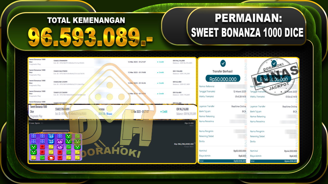 Bukti JP SWEET BONANZA 1000 DICE – ucapkan selamat kepada user id Venxxx atas kemenangan di SWEET BONANZA 1000 DICE dengan total kemenangan Rp96.593.089,- . Yang pasti nya langsung LUNAS sesuai bukti ya bosku. Dorahoki nih bosku berapapun akan tetap kami bayar lunas ya bosku.