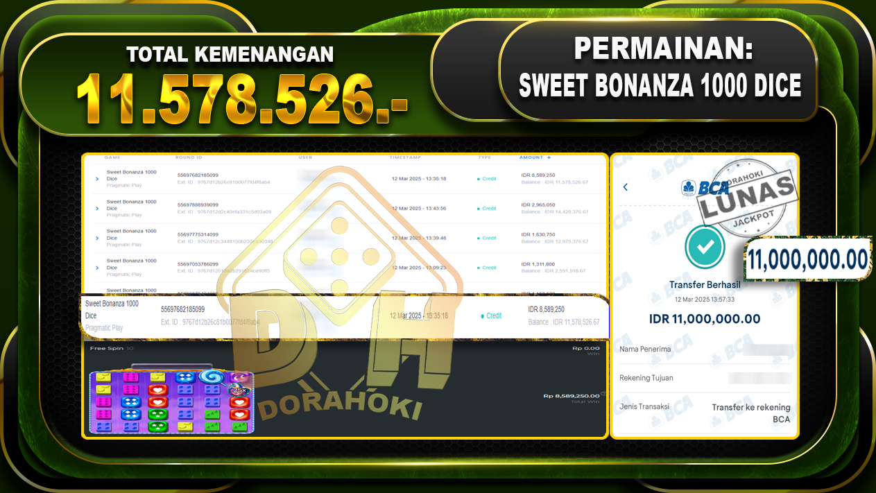 Bukti JP SWEET BONANZA 1000 DICE – ucapkan selamat kepada user id Abayxxx atas kemenangan di SWEET BONANZA 1000 DICE dengan total kemenangan Rp11.578.526,- . Yang pasti nya langsung LUNAS sesuai bukti ya bosku. Dorahoki nih bosku berapapun akan tetap kami bayar lunas ya bosku.