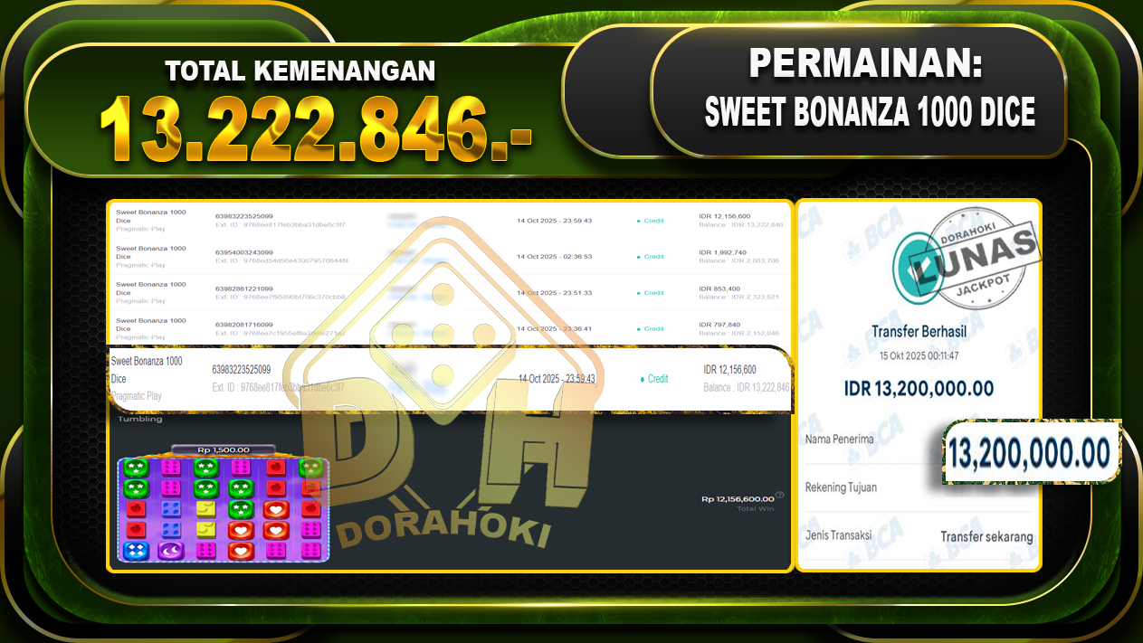 Bukti JP Sweet Bonanza 1000 Dice – ucapkan selamat kepada user id olexxxx atas kemenangan di Sweet Bonanza 1000 Dice dengan total kemenangan Rp.13.222.846,- Yang pasti nya langsung LUNAS sesuai bukti ya bosku. Dorahoki nih bosku berapapun akan tetap kami bayar lunas ya bosku.
